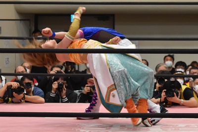 ヒカリブロック、ロープに飛ぶ、ユキカウンターで持ち上げて投げ切る(右写真)。中島にタッチ。