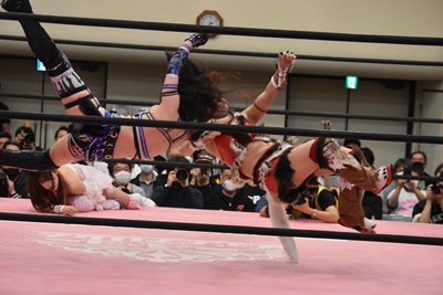 ユカッチ落下(左写真)。中島かバー、カウント2。