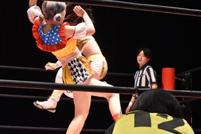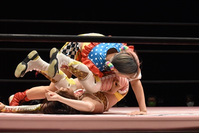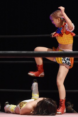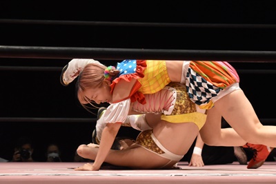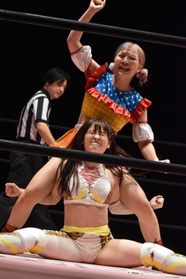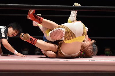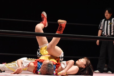 ぽむスネ蹴りから首固め(右写真)、カウント2。