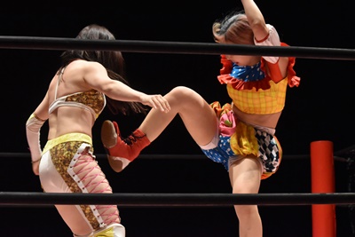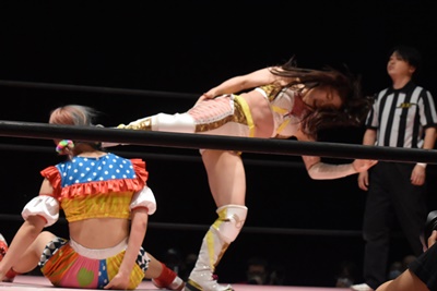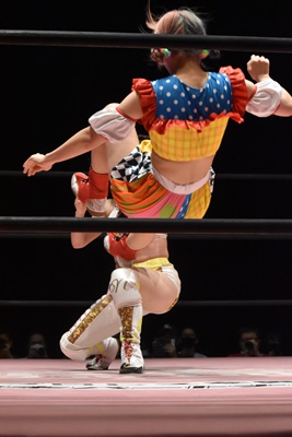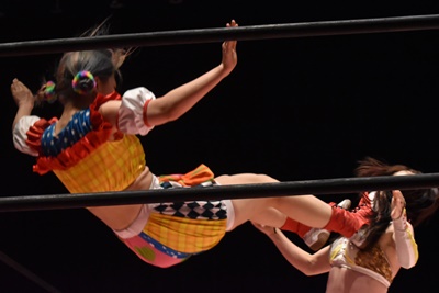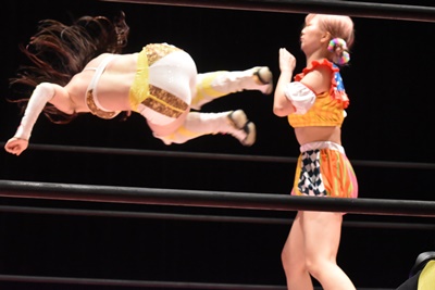 ぽむダウンしたように見せてラフォーレ原宿に。コーナーに上ってミサイルキック(右写真)、カウント2。