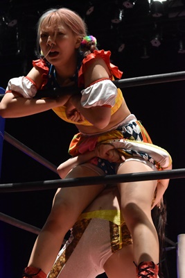 ぽむミサイルキック狙ってコーナーに上る、なつぽいデッドリードライヴ。ロープに固定して背中にドロップキック、さらにジャーマン狙うがぽむはロープをつかんで抵抗(左写真)。