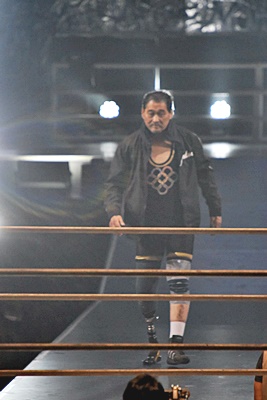 時間差バトルロイヤルの最初の入場者は谷津嘉章!義足で花道を入場(右写真)。