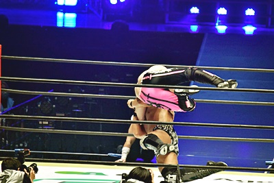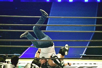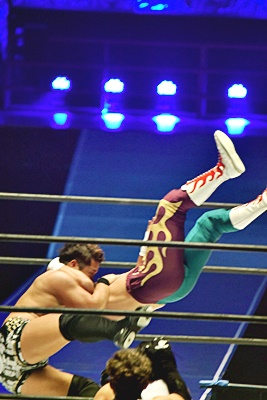 勝村と石井が入る、勝村コーナーに振って突っ込む、石井ジャンプして背後に着地すると投げっぱなしジャーマン(右写真)