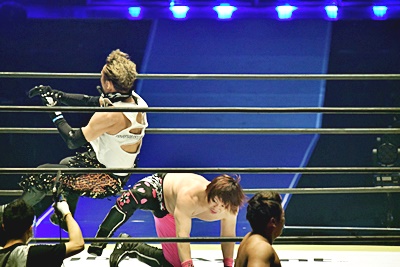 ジャンピングダブルニードロップ(右写真)、翔太にタッチ。