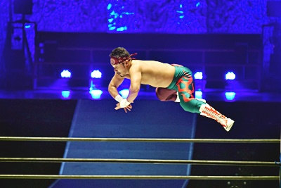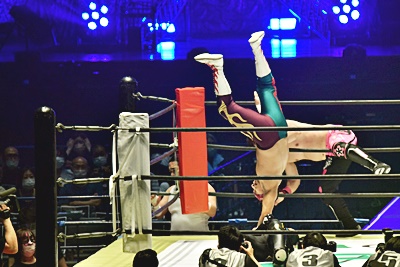 コーナーに上って「ムーンサルト!」と叫んでからのリバーススプラッシュ、翔太かわす(左写真)。