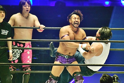 大家怒る(左写真)。しかし石井と岩崎のロープワークに巻き込まれて花道でダウン。