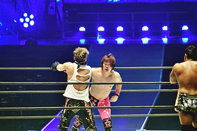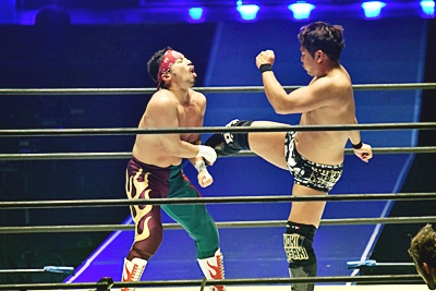 勝村は石井のソバットをブロックして旋風脚(右写真)、岩崎にタッチ。石井も翔太にタッチ。