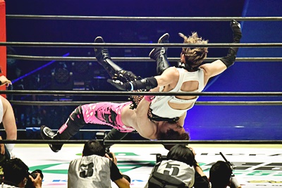 高角度ダブルアームDDTはブロックされるが、持ち上げて(左写真)