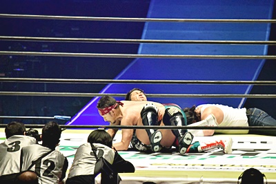 連打をかわして十字架固め(左写真)、カウント2。