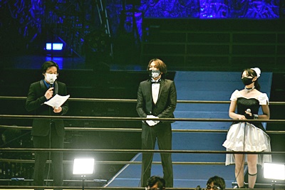 井上マイク、味方冬樹、難波小百合の3団体のリングアナが揃いサイバーファイトフェスの本編がスタート(右写真)。