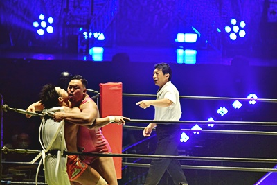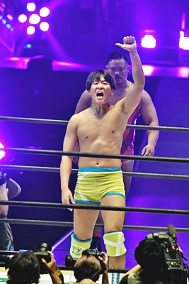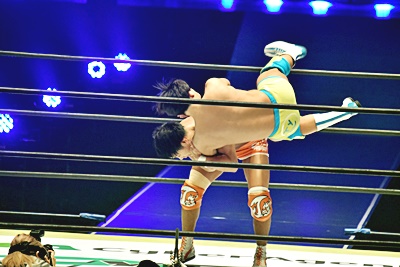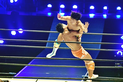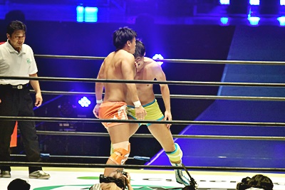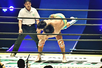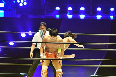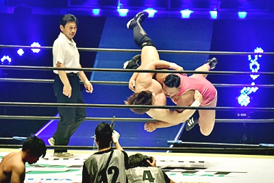岡田サイドスープレックス(右写真)、宮脇にタッチ。