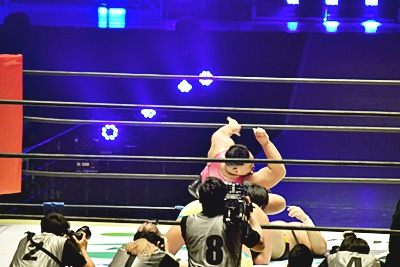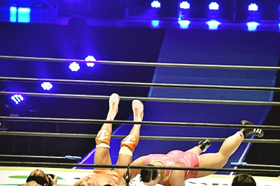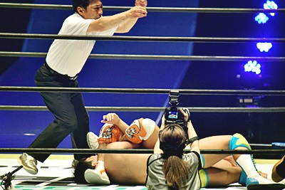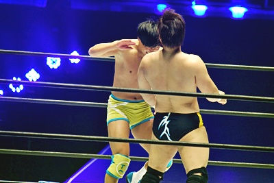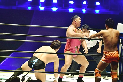 飯野ボディスラム、小嶋が入って岡田の足を押さえると飯野がハカエルボーの体勢に(左写真)。5分経過。