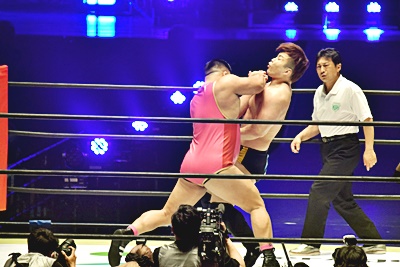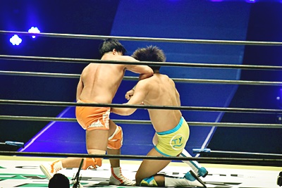 ロープに飛ぶ、飯野カウンターのスピアー(右写真)、小嶋にタッチ。