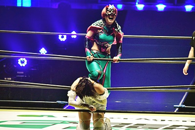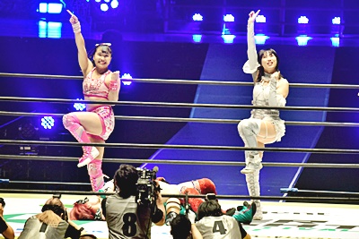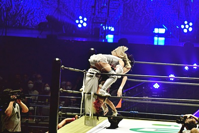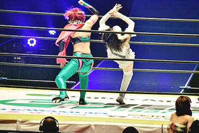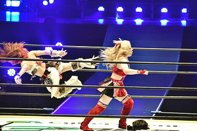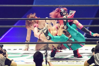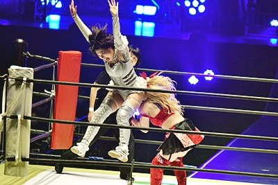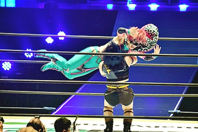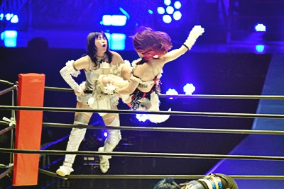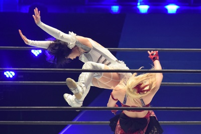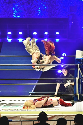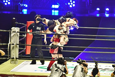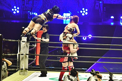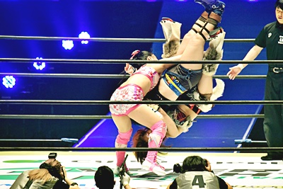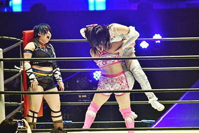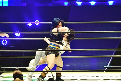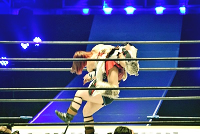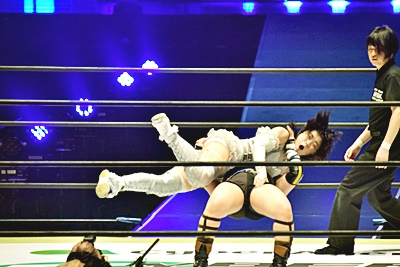 ユキが未詩にショルダーブロック、中島がユキにウラカン・ラナ(左写真)、