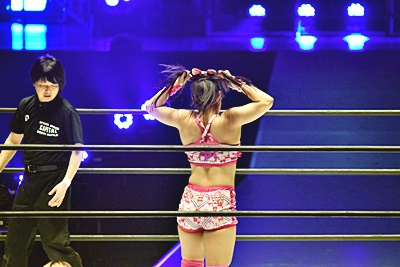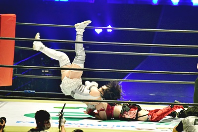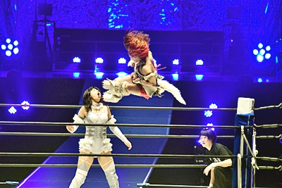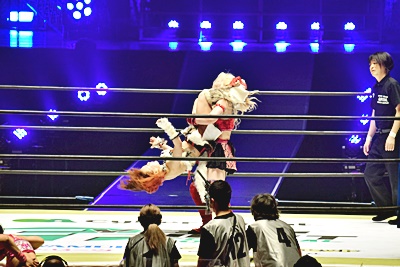 リカがコーナーからダイブするが中島が下からドロップキックで迎撃(左写真)、