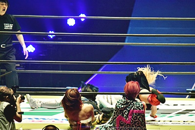 爆シスがダブルのボディプレス狙ってロープに飛ぶ、享楽共鳴がリング下から足を引っ張る(右写真)。