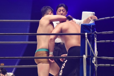 北宮コーナーに振る、岡谷切り返して串刺しエルボー(左写真)。