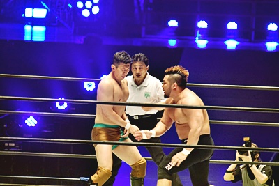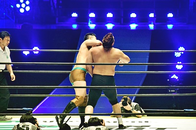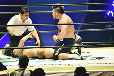 岡谷ヘッドロック、北宮サイトースープレックス狙う、岡谷身を翻して押しつぶす(左写真)。カウント2。