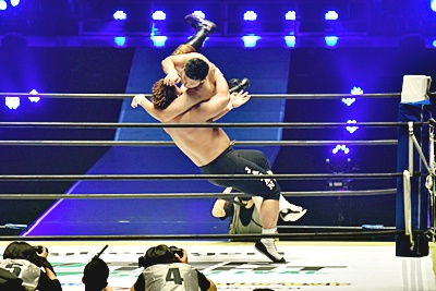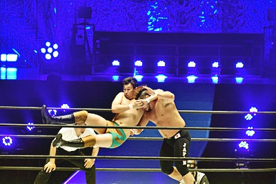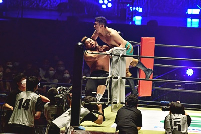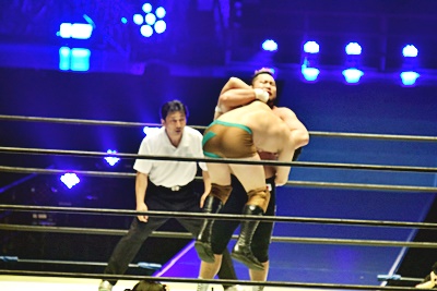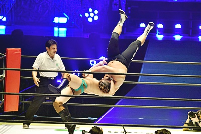 北宮ブレーンバスター狙うが岡谷ブロックして逆に投げる(右写真)。