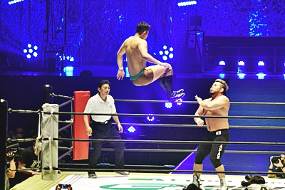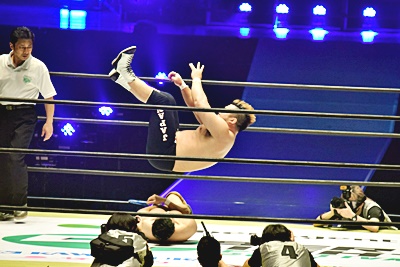北宮ボディスラム、ロープに飛んでセントーン(左写真)、カウント2。
