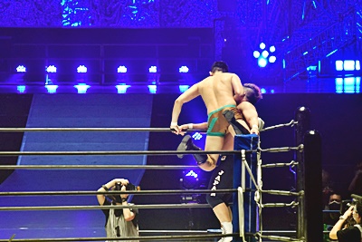 岡谷コーナーに上ってミサイルキック(右写真)。
