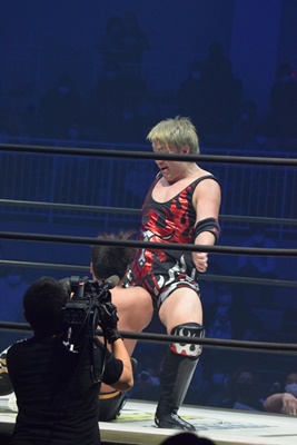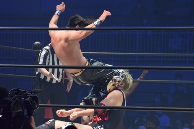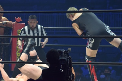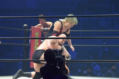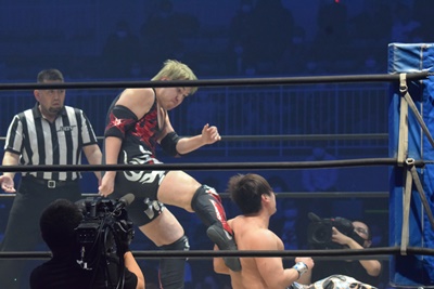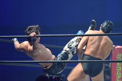 正面跳びドロップキック(右写真)、岡林にタッチ。