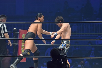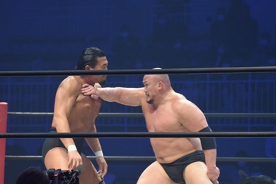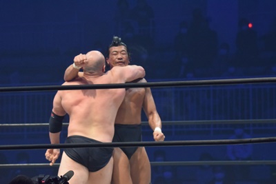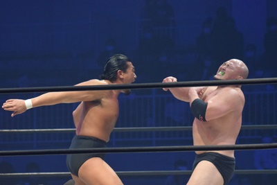 先発は岡林と納谷。ロックアップ、ブレーク。再度ロックアップ、岡林ヘッドロック、ショルダーブロックの打ち合いで納谷が勝つ(左写真)。両軍タッチ。