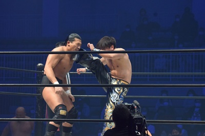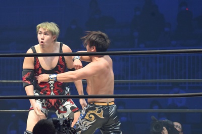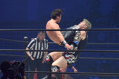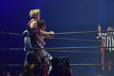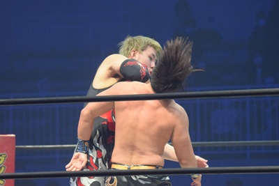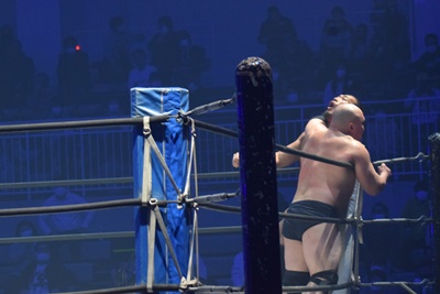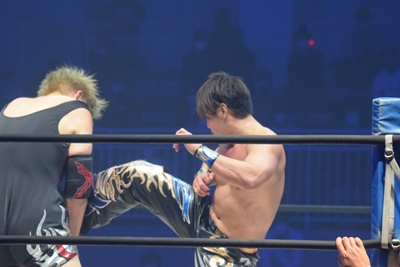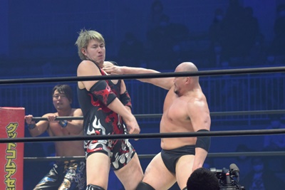 納谷コーナースプラッシュからDDT、カウント2。納谷チョークスラム狙う、岡林ブロックして逆水平連打(右写真)、