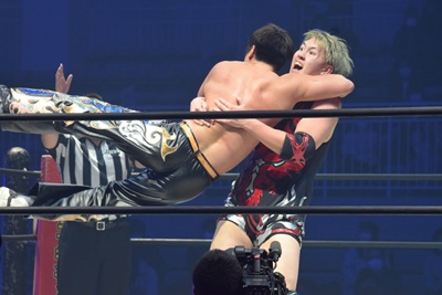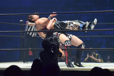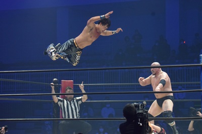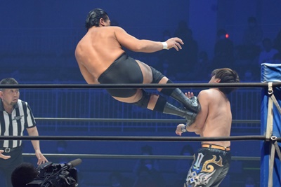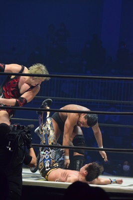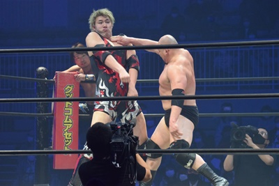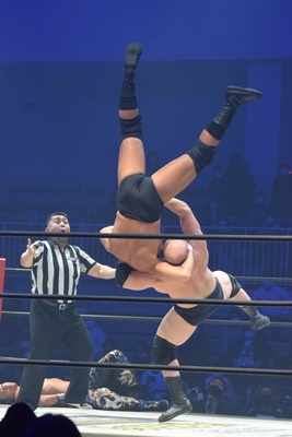 HARASHIMAスワンダイブプレス(右写真)、カウント2。