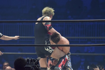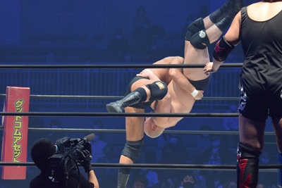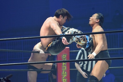 樋口二度目のアルゼンチン狙いをブロック、ロープに振ってアバランシュホールド(左写真)、納谷にタッチ。