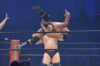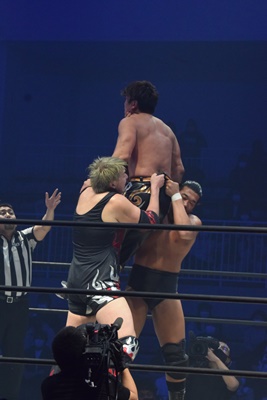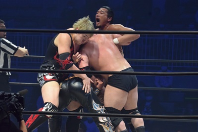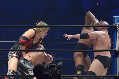 ダブルのチョークスラム(左写真)。樋口は納谷に勝負を託し岡林を押さえに行く。