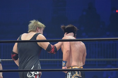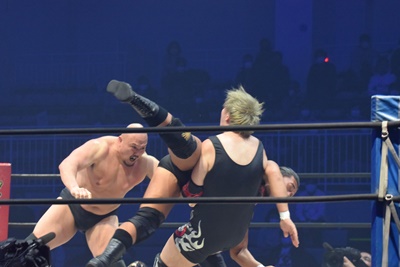 ダブルのショルダーブロックから納谷がボディスラム、エルボードロップ、カウント2。顔面ひねり(左写真)、HARASHIMAロープ。樋口入ってチョップ連打、カウント2。HARASHIMA逆水平、樋口チョップ、納谷にタッチ。