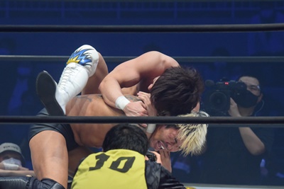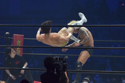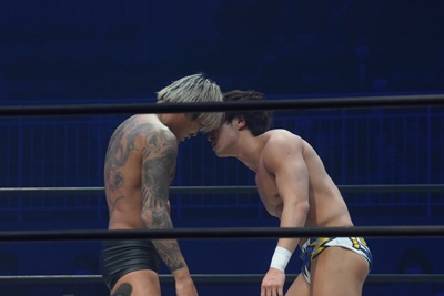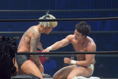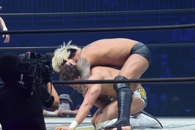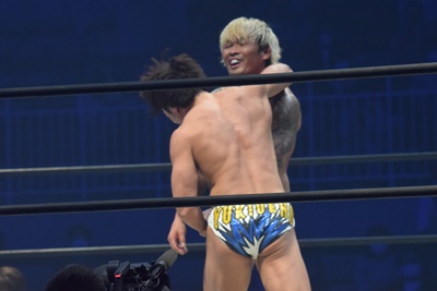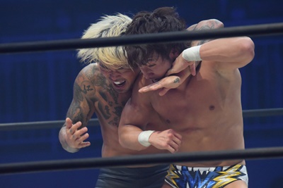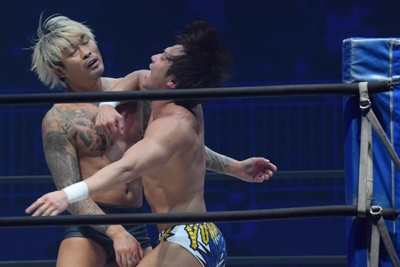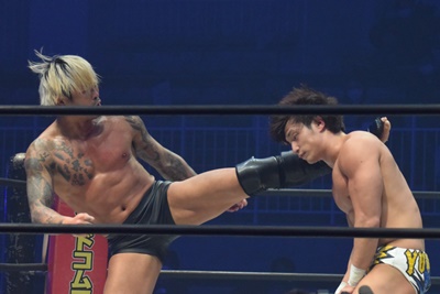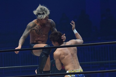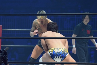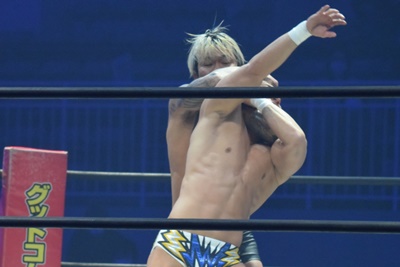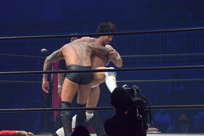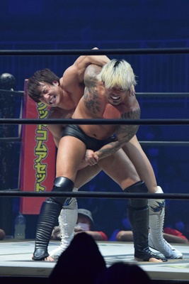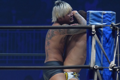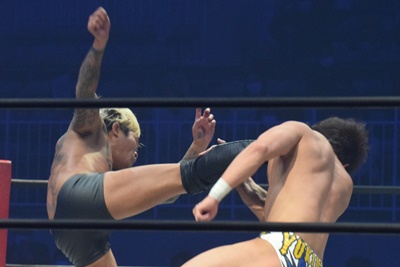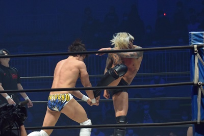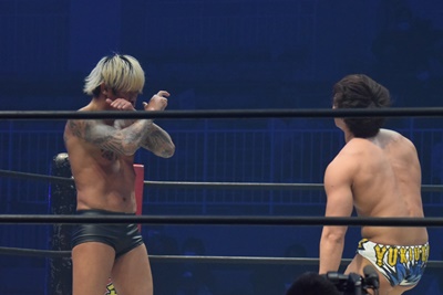 坂口腹パン、上野エルボー連打(右写真)。