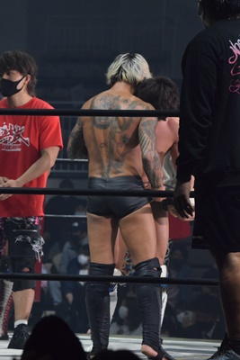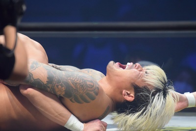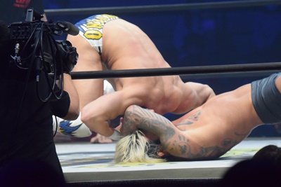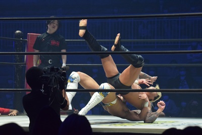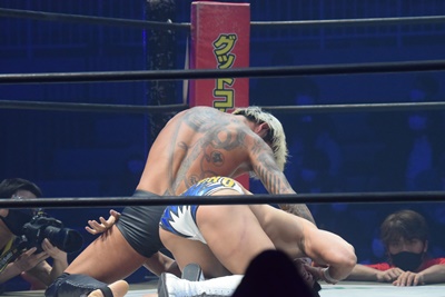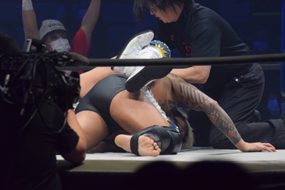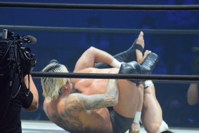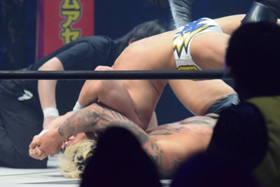 引き倒されると後方回転して坂口の両肩をつける(右写真)、カウント2。上野坂口の腕を取ってトップロープ飛び越えアームブリーカーに。