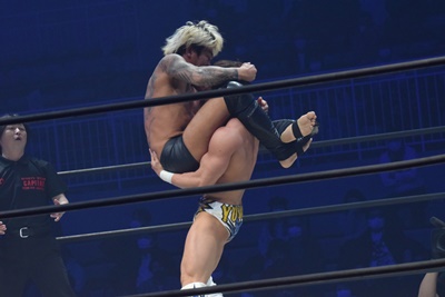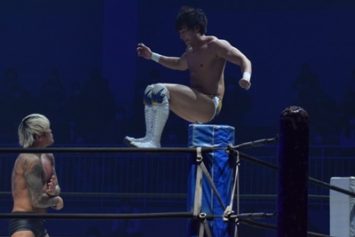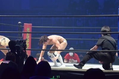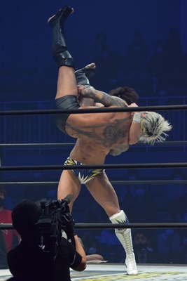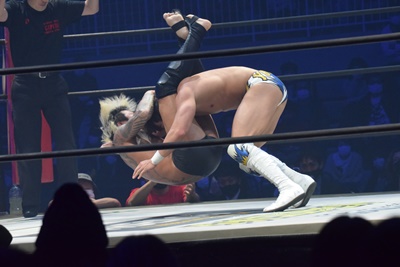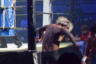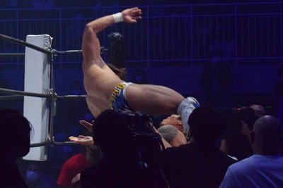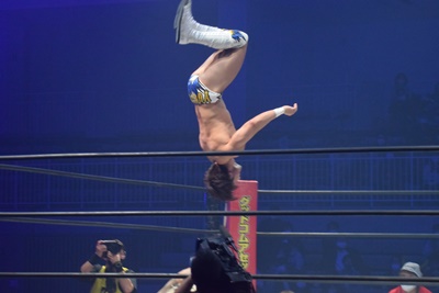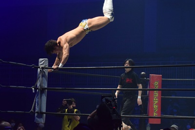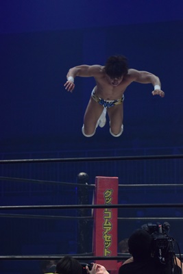 上野コーナーに上ってフロッグスプラッシュ(右写真)、カウント2。