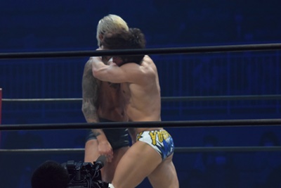 バスター(左写真)、坂口放さない。上野ロープ。10分経過。