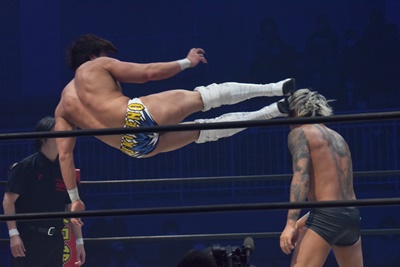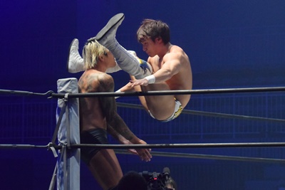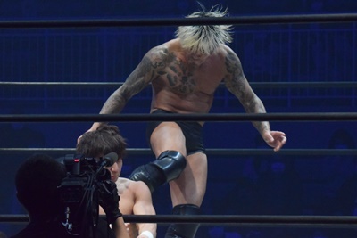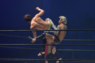 上野坂口の頭にドロップキック(右写真)。
