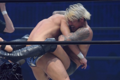 上野持ち上げる、坂口戻す。上野もう一度持ち上げて(右写真)、