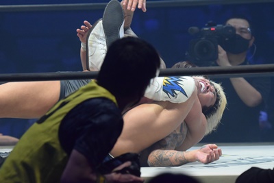 上野リングに戻るとトップロープ越しに坂口の腕にフットスタンプ。坂口の腕をハンマーロックに固めて鉄柱にぶつける(左写真)。