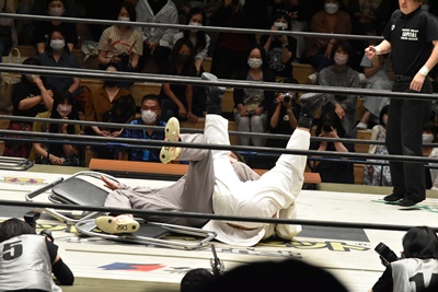 MAOはイス目掛けて河津落とし(右写真)。※柔道では河津掛は禁止。