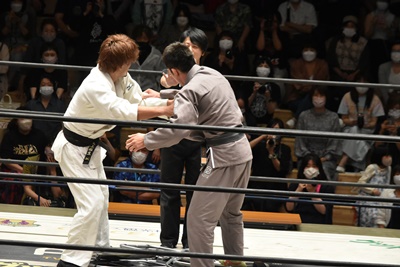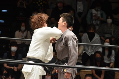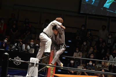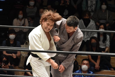 三本目、両者道着を着なおしてハードコア柔道ルールに臨む。といっても最初は普通に柔道スタイル(右写真)。