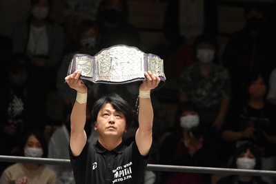 木曽主審がEXTREMEのベルトを掲げる(右写真)。