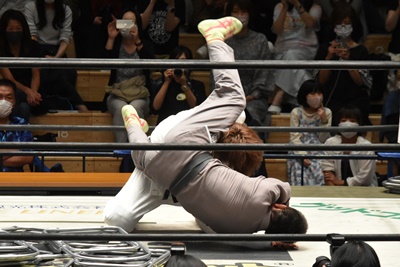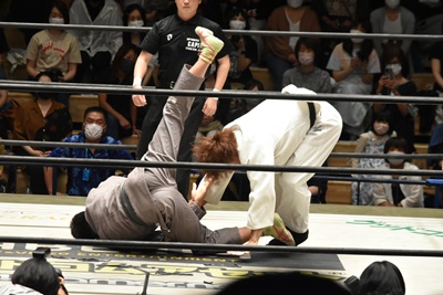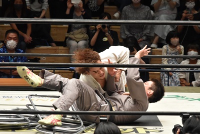MAOはイス目掛けて青木を内股(右写真)、