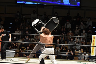 MAOヘッドロックに取るが、青木はイスを手に取りMAOの首に引っ掛ける(左写真)。
