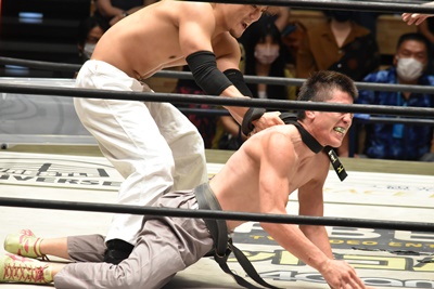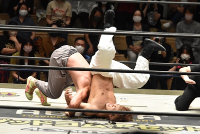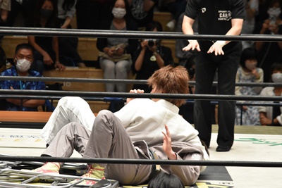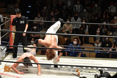 MAO青木を落とそうとする、青木こらえる(左写真)。