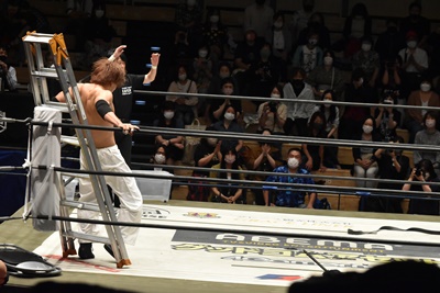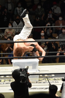 ラダー目がけて青木を投げつける(右写真)。