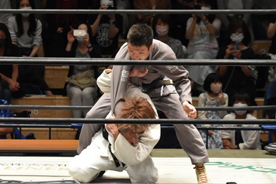青木が一本背負狙うがMAOこらえて絞めに行く(右写真)、
