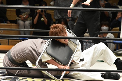 イスによる絞め(右写真)。これぞハードコア柔道!