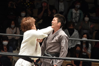 一本かと思われたがハードコア柔道では普通の一本勝ちはない(左写真)。