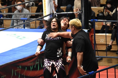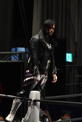 佐々木「後楽園ホールの皆さん、こんばんは。DAMNATIONです。この試合が終わったっていうことは俺たちDAMNATIONは解散だ。今の俺のリアルな気持ちは、解散なんてしない、なんて思っちゃいない。俺たちは確実に解散する。俺たちDAMNATIONは5年間常にベストを尽くしてきた。もうやり残したことはない。思えば5年前、俺が石川修司・・・」(左写真)
